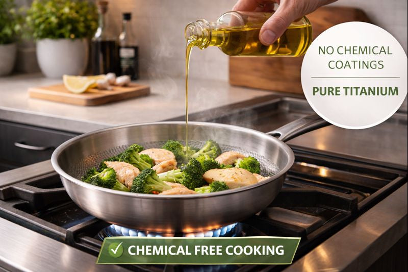 Cocinar con titanio permite preparar alimentos sin químicos innecesarios. Al no requerir recubrimientos artificiales para funcionar correctamente, se convierte en una alternativa ideal para quienes buscan cuidar su alimentación y la de su familia, reduciendo la exposición a materiales potencialmente perjudiciales.